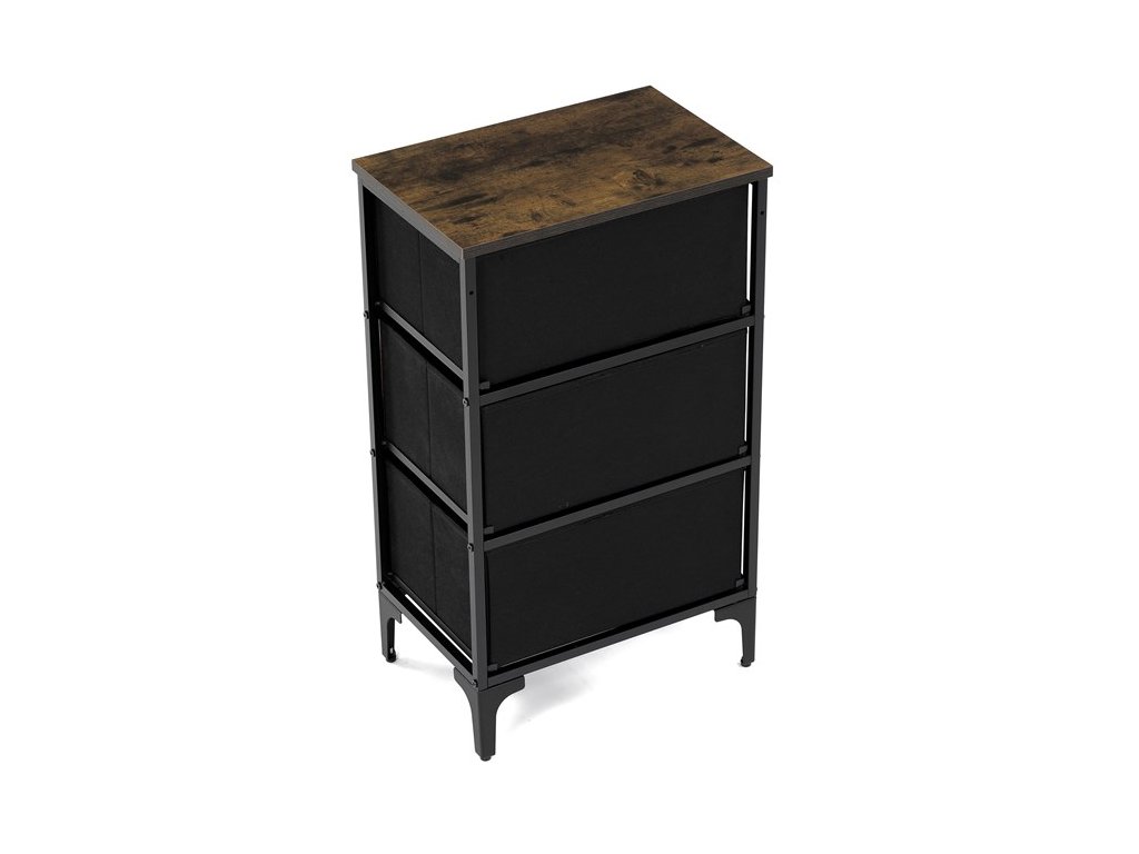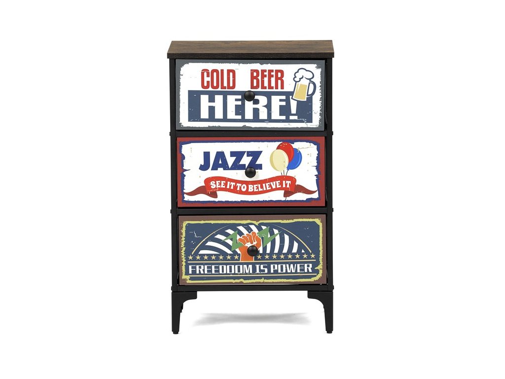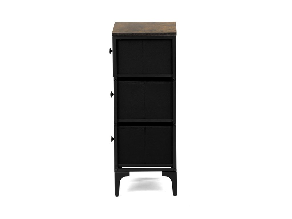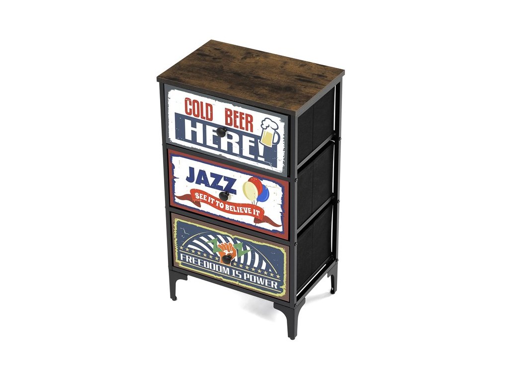 Retro komoda značky Autronic prinesie do vášho interiéru jedinečný štýl a originalitu. Textilné čelá zásuviek s výplňou HDF a vintage potlačou navodzujú atmosféru starých amerických barov a jazzových klubov. Kombinácia čiernej kovovej konštrukcie, dosky v dekore starého dreva a ozdobných nôh dodáva nábytku robustný, ale zároveň elegantný vzhľad. Korpus zásuviek je vyrobený z netkanej textílie s výplňou HDF, čo zaisťuje ich ľahkosť a jednoduchú manipuláciu. Ideálny doplnok do obývacej izby alebo štýlovej kaviarne, kde sa stane neprehliadnuteľným prvkom.