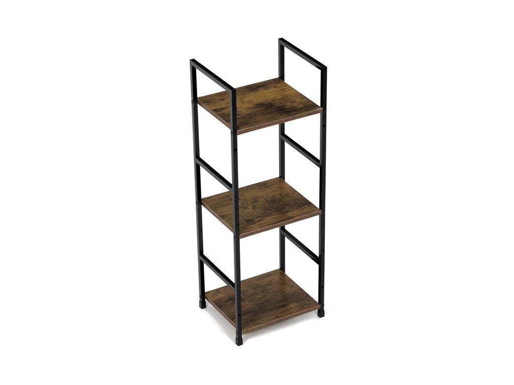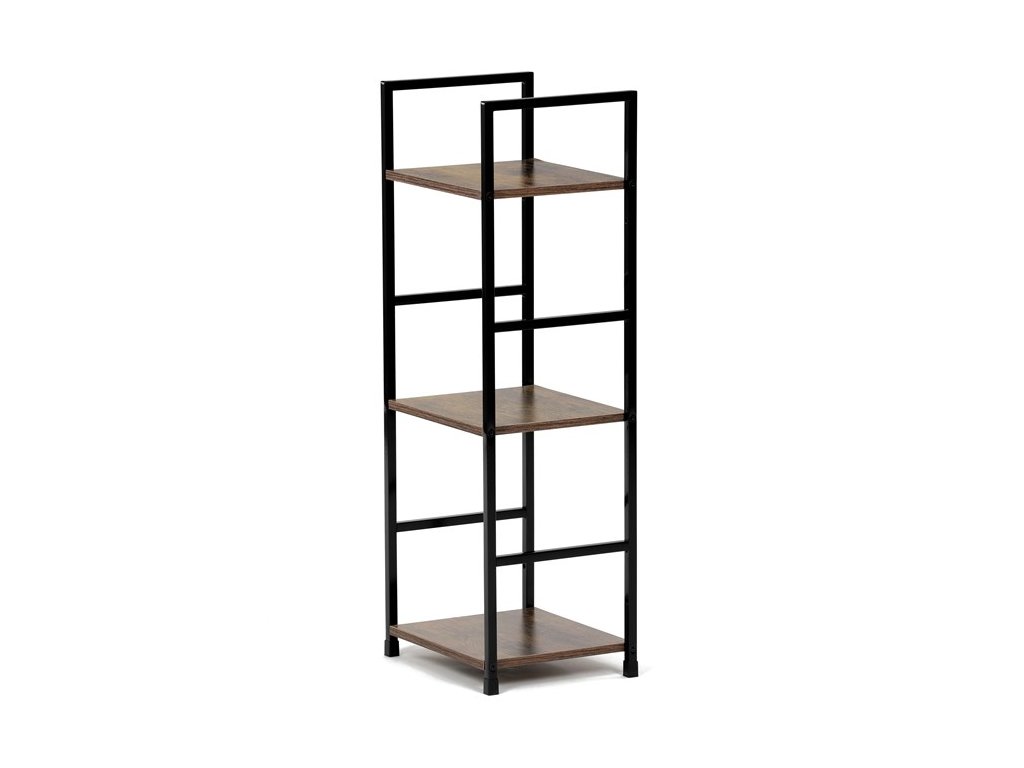 Odľahčený policový regál. Kostra vyrobená z kovových hranatých profilov čiernej farby. Na police je použitá MDF doska s povrchovou úpravou 3D fólie v textúre duba. Balenie obsahuje sadu umožňujúcu pripevnenie k stene.