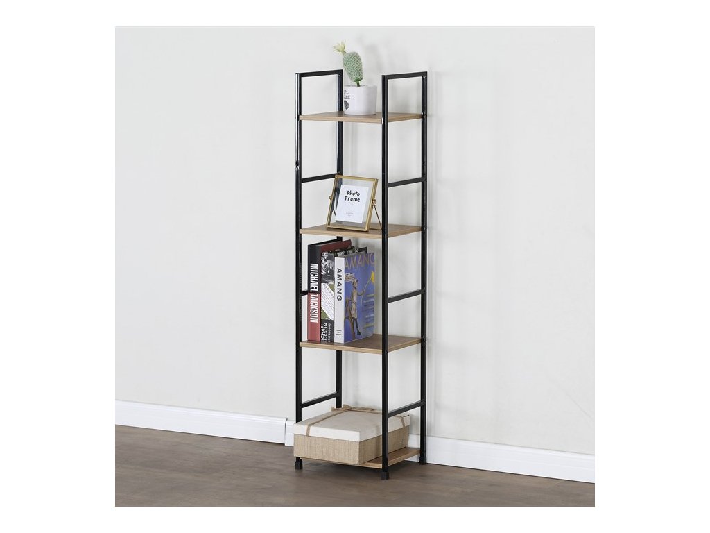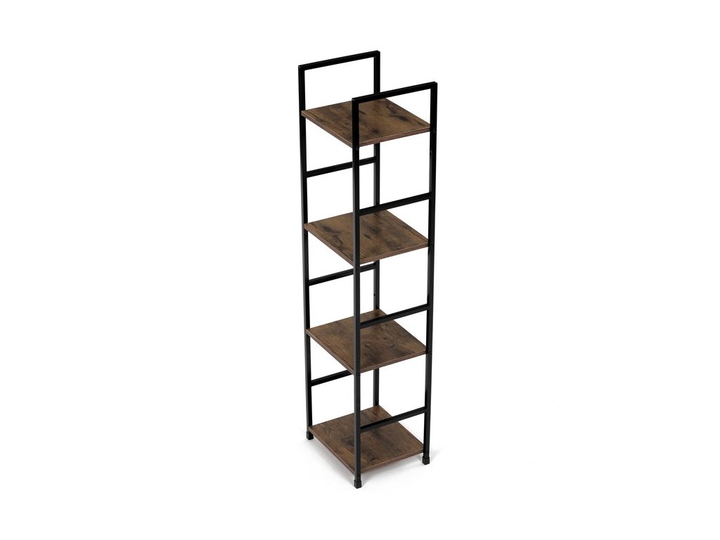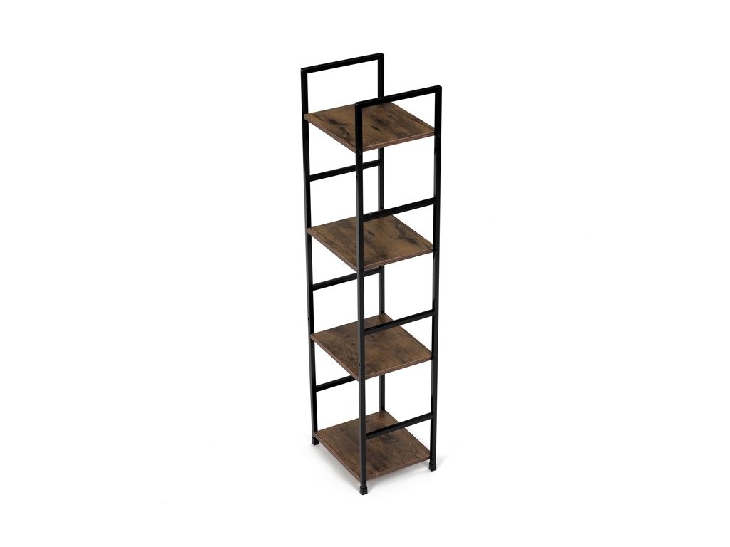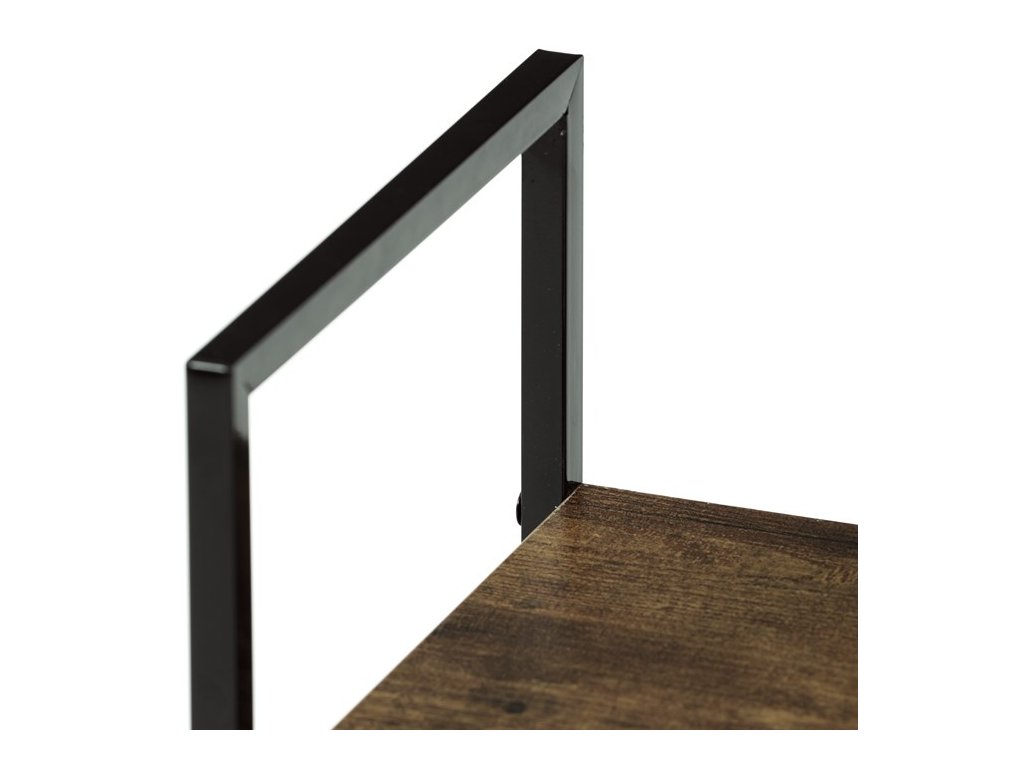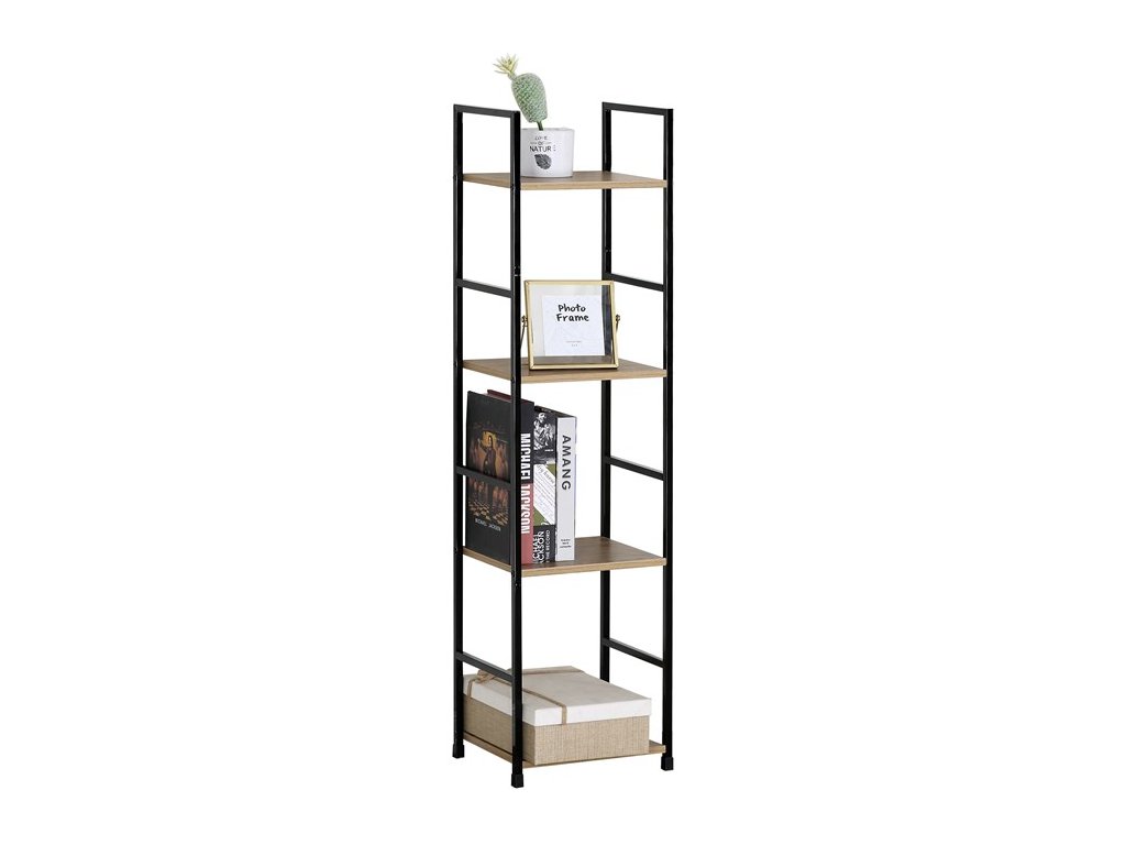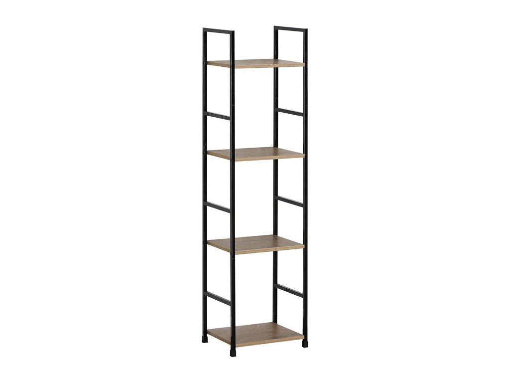 Odľahčený policový regál. Kostra vyrobená z kovových hranatých profilov čiernej farby. Na police je použitá MDF doska s povrchovou úpravou 3D fólie v textúre duba. Balenie obsahuje sadu umožňujúcu pripevnenie k stene.