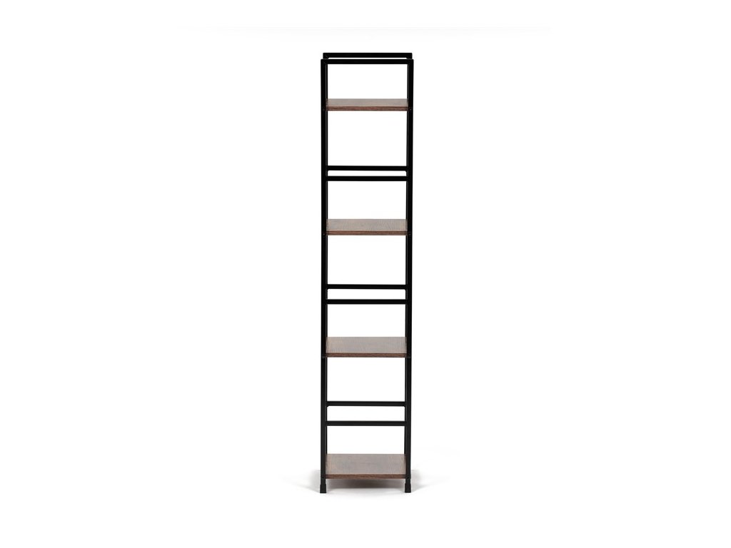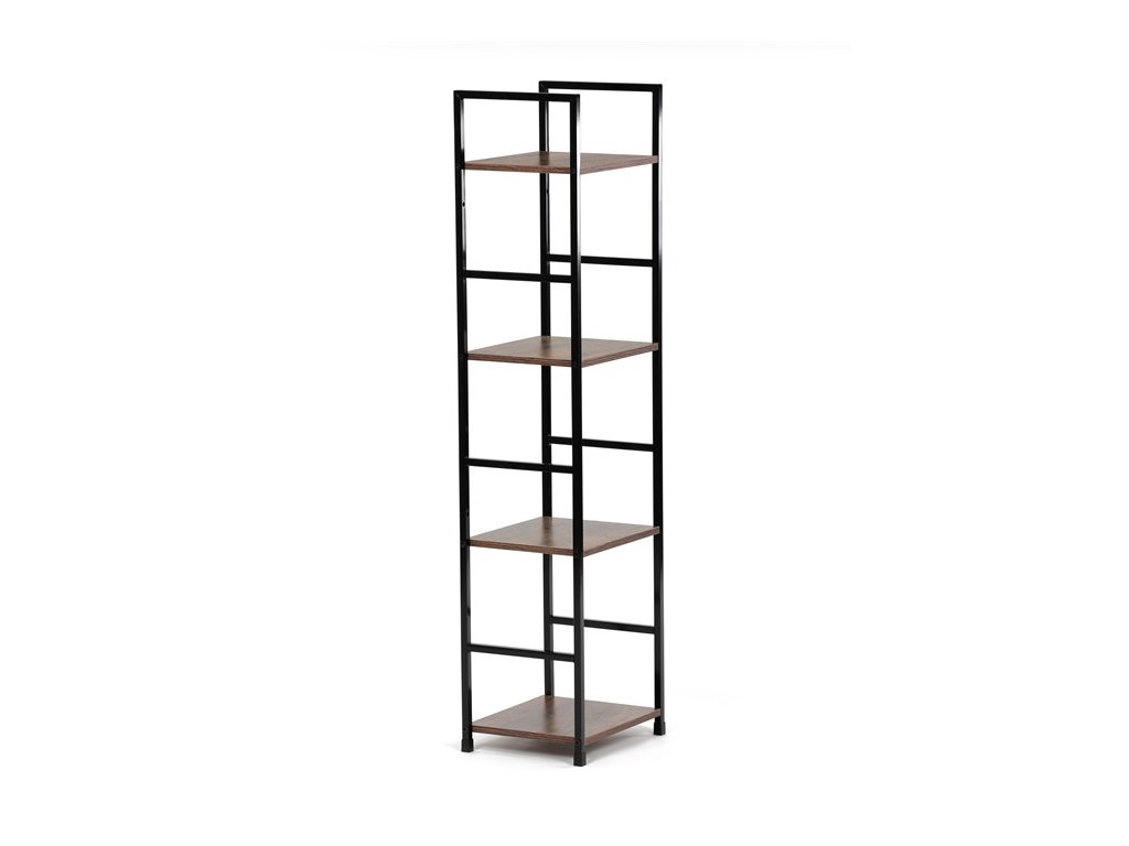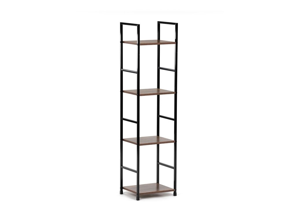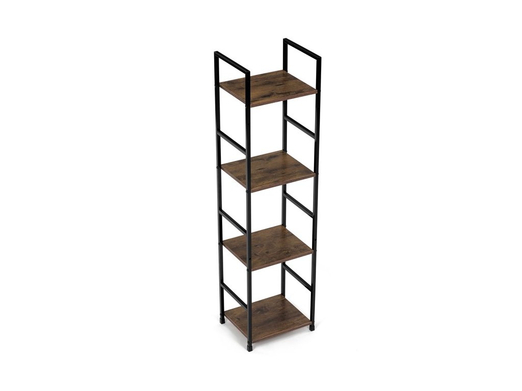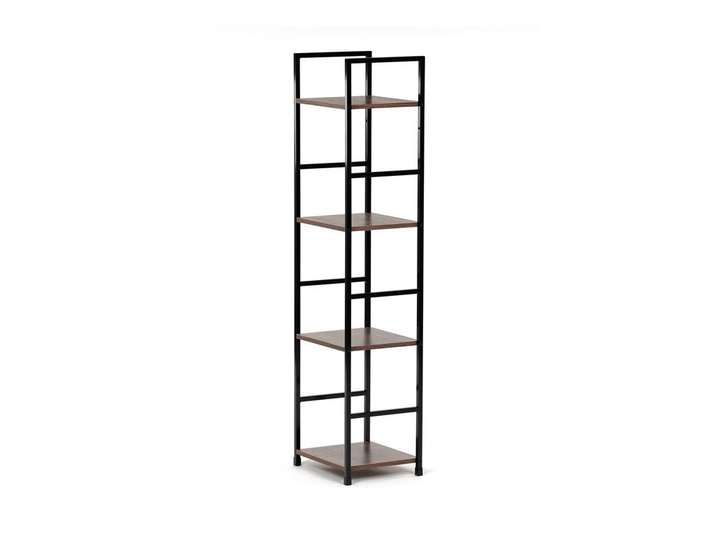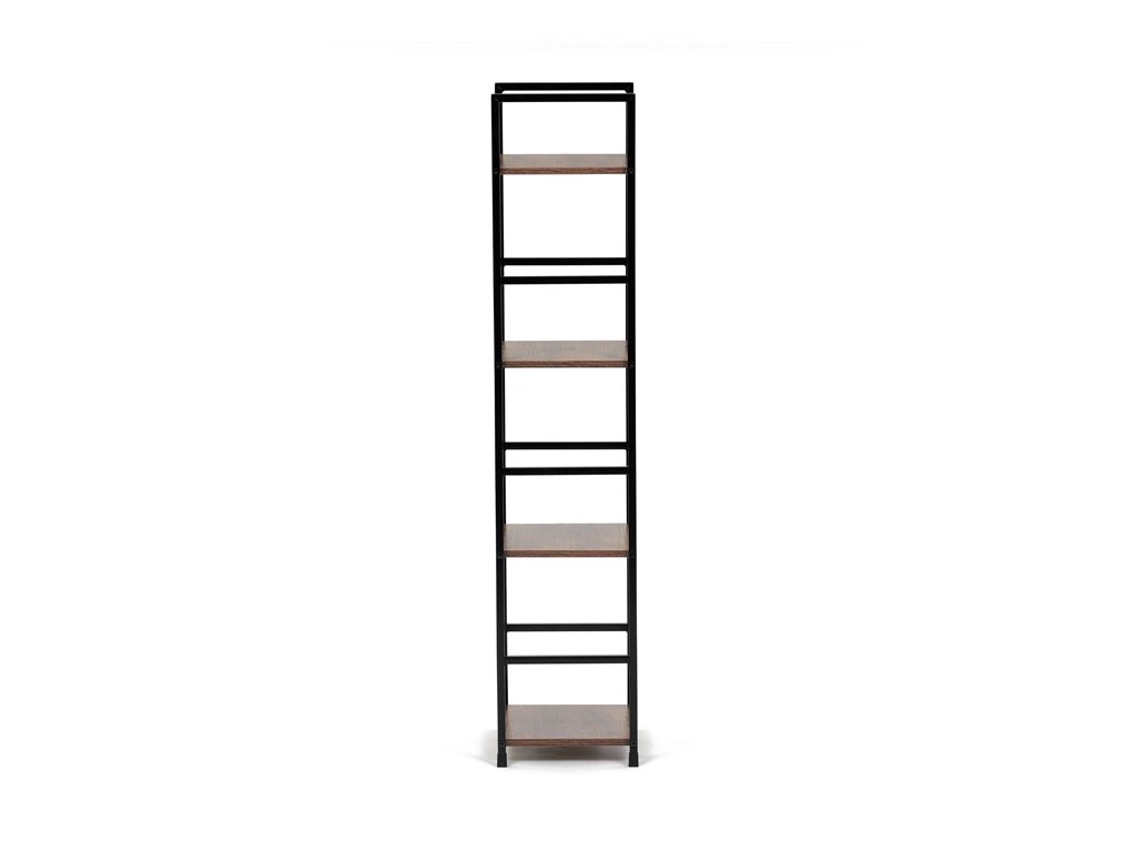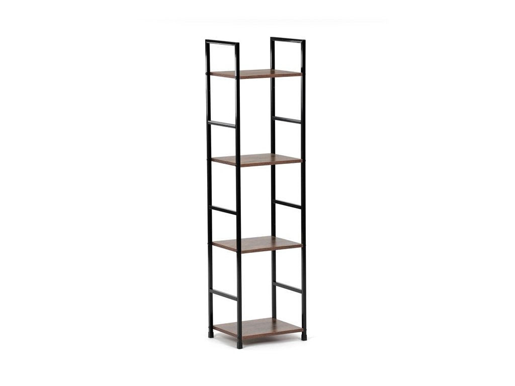 Odľahčený policový regál. Kostra vyrobená z kovových hranatých profilov čiernej farby. Na police je použitá MDF doska s povrchovou úpravou 3D fólie v textúre duba. Balenie obsahuje sadu umožňujúcu pripevnenie k stene.