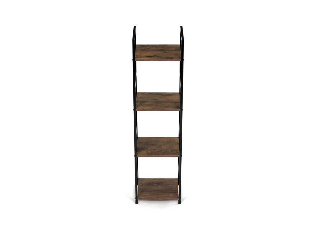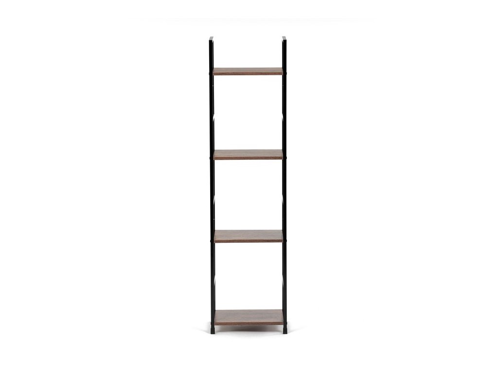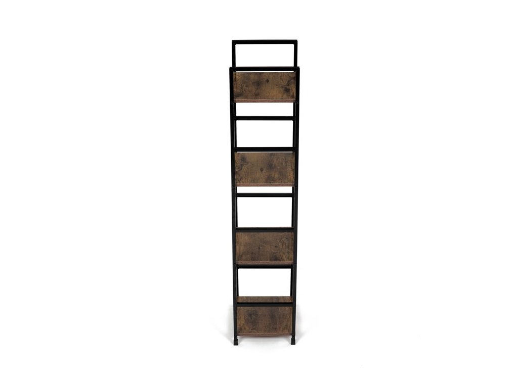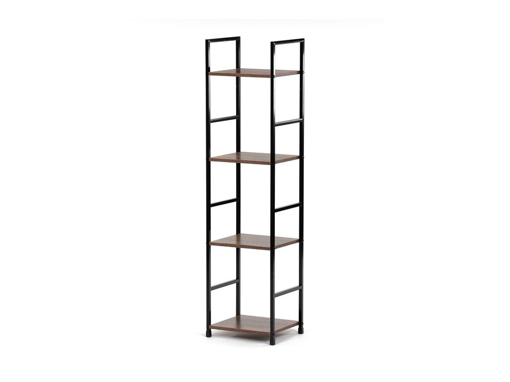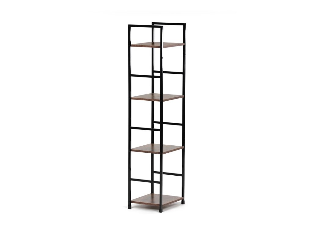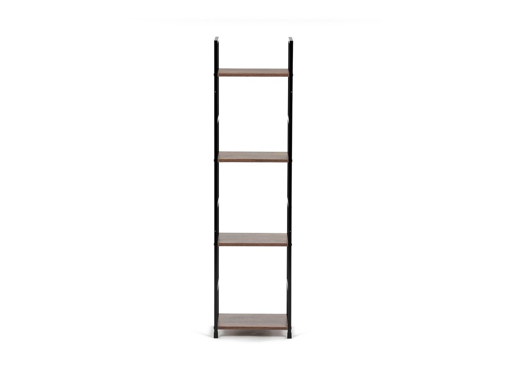 Odľahčený policový regál. Kostra vyrobená z kovových hranatých profilov čiernej farby. Na police je použitá MDF doska s povrchovou úpravou 3D fólie v textúre duba. Balenie obsahuje sadu umožňujúcu pripevnenie k stene.