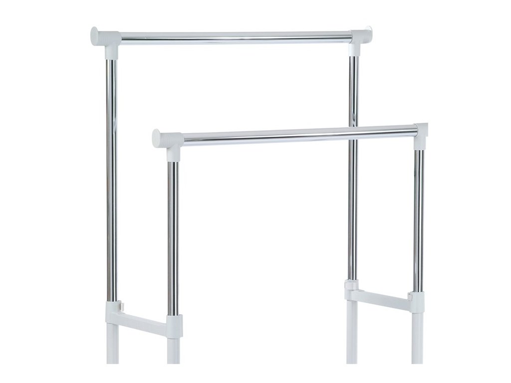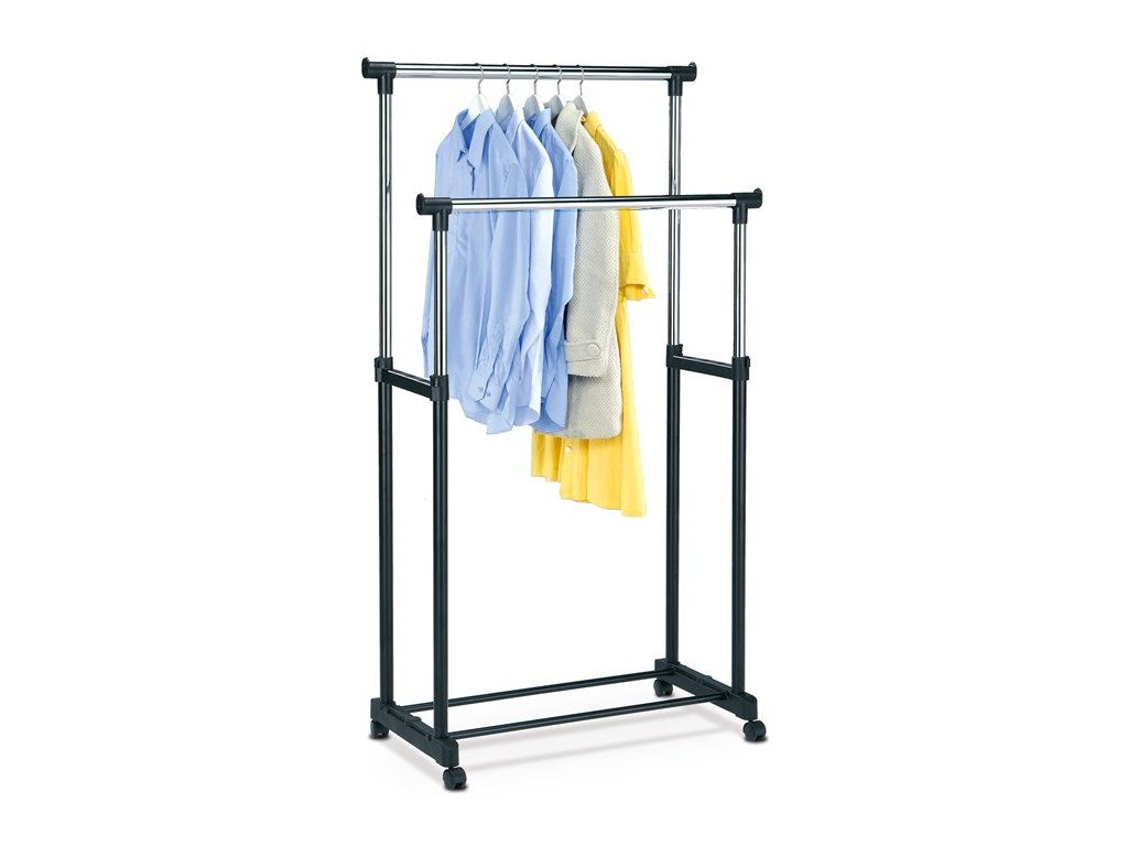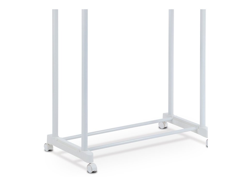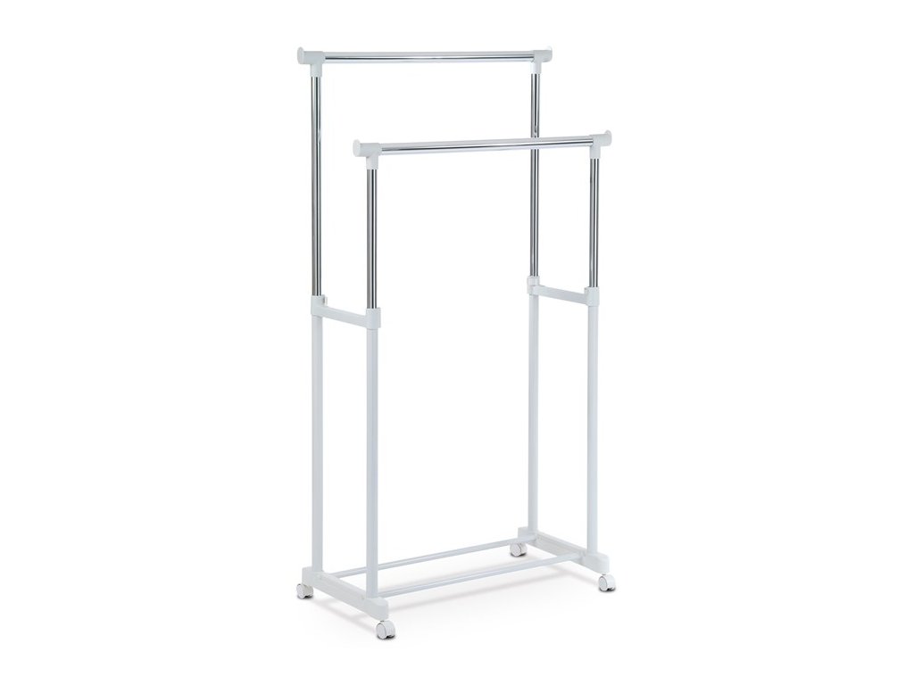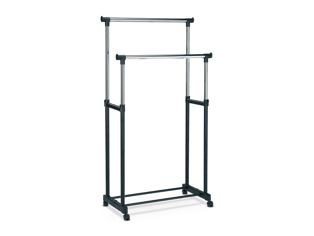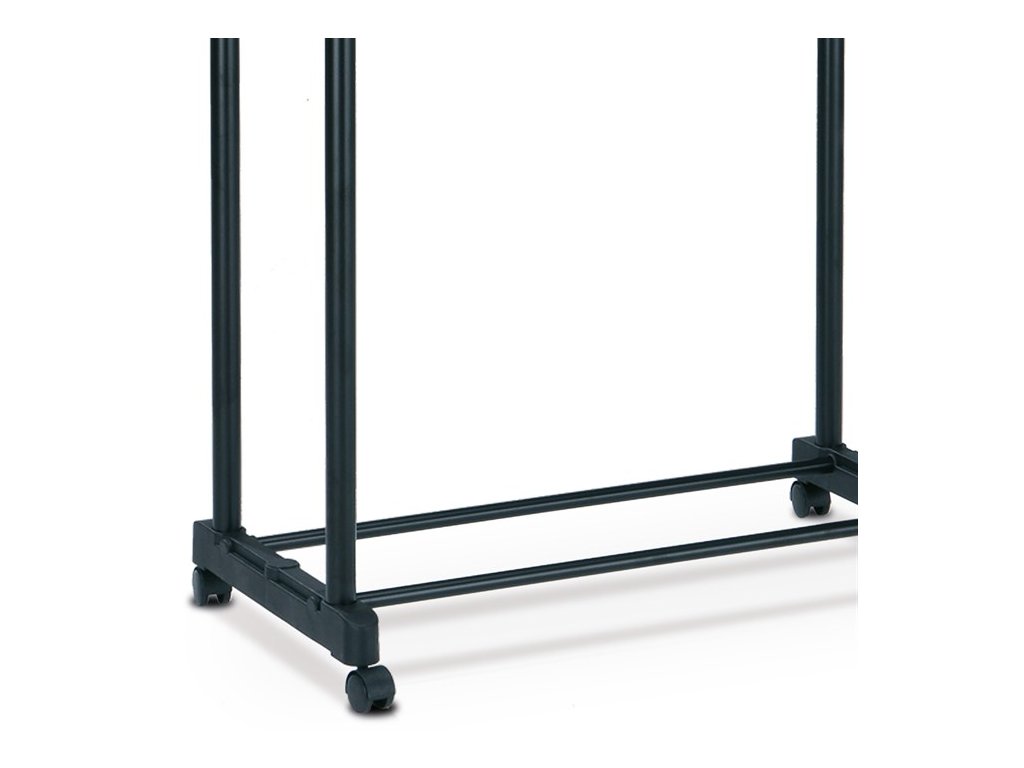 Dvojramenný stojan na šaty v čiernom prevedení kombinuje pevný kovový rám s plastovými prvkami pre stabilitu a jednoduchú manipuláciu. Výškovo nastaviteľná horná tyč umožňuje prispôsobenie podľa potreby, čo zabezpečuje optimálne využitie priestoru a pohodlné zavesenie odevov rôznych dĺžok. Spodný odkladací priestor ponúka praktické miesto na uloženie topánok alebo ďalších doplnkov. Stojan je vybavený kolieskami, ktoré uľahčujú presun v interiéri bez poškodenia podlahy. Kompaktný dizajn a kvalitné materiály zaručujú dlhodobé používanie v domácnostiach aj komerčných priestoroch.