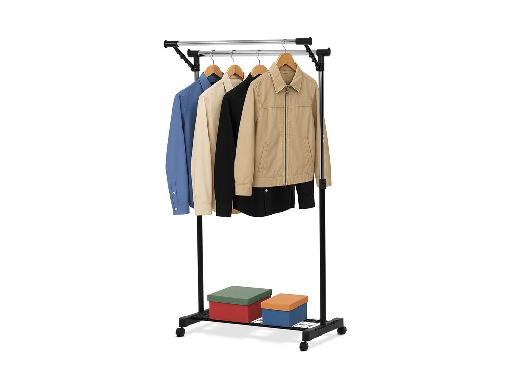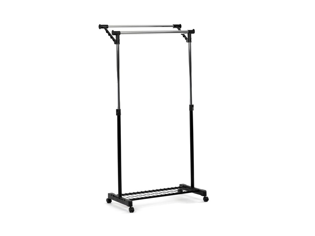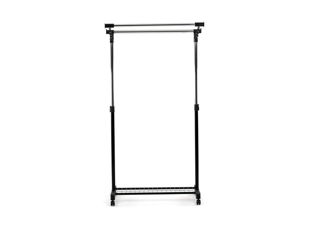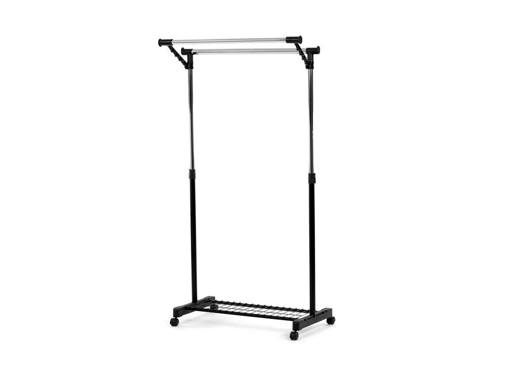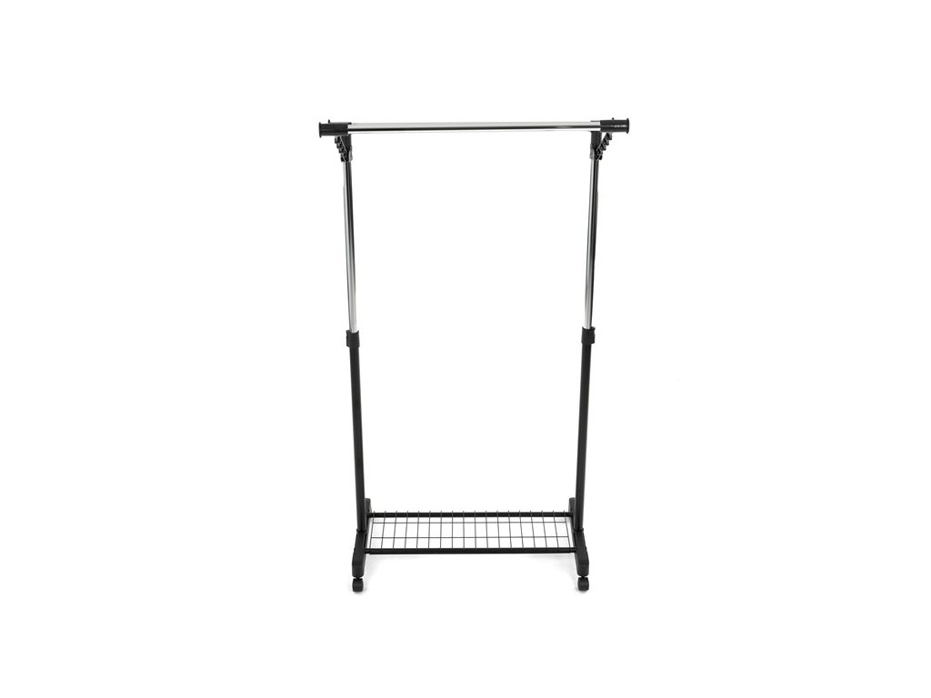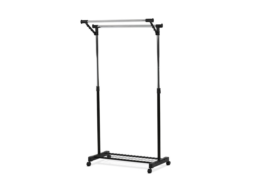 Mobilný stojan na šaty značky Autronic je praktickým riešením na uloženie oblečenia v spálni, šatni alebo predsieni. Čierna kovová konštrukcia doplnená chrómovými detailmi zaisťuje moderný vzhľad a vysokú stabilitu. Vďaka nastaviteľnej výške sa ľahko prispôsobí vašim potrebám. Dolná mriežkovaná polica poskytuje ďalší úložný priestor, napríklad na topánky či tašky. Stojan je vybavený kolieskami, čo umožňuje jednoduchú manipuláciu. Je ideálnym doplnkom pre tých, ktorí hľadajú flexibilitu a funkčnosť spojenú s elegantným designom.
