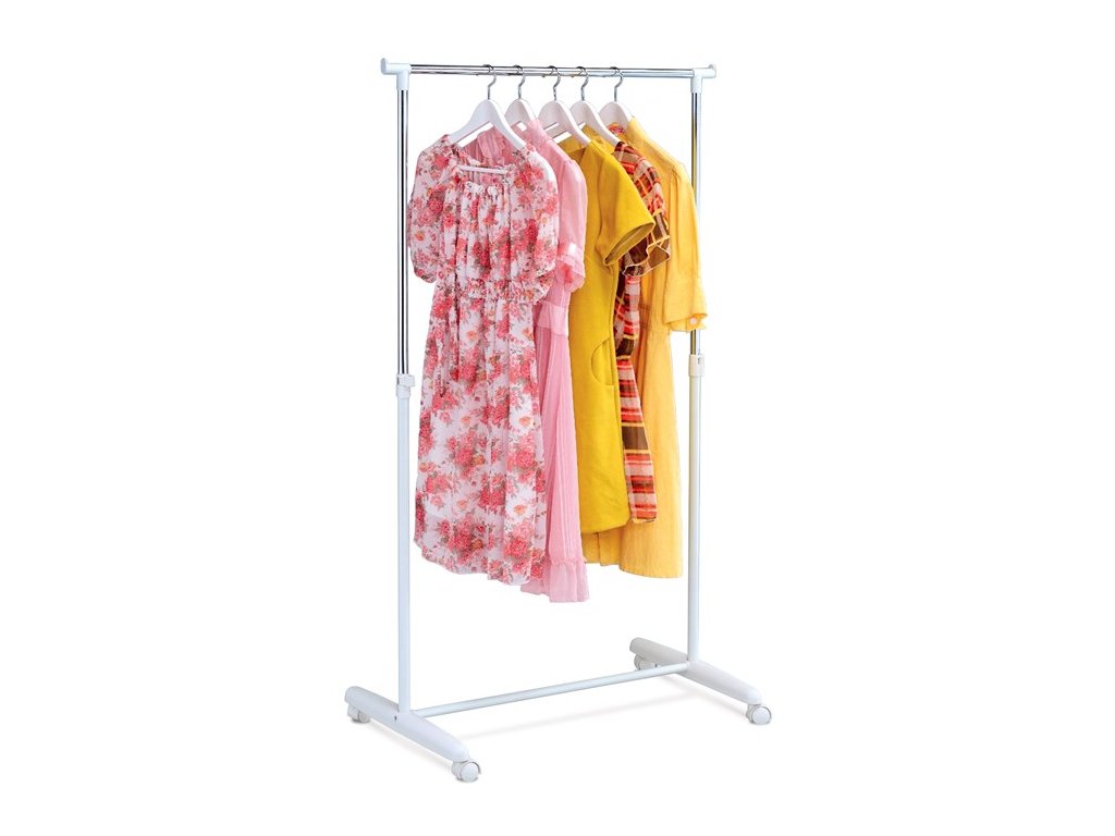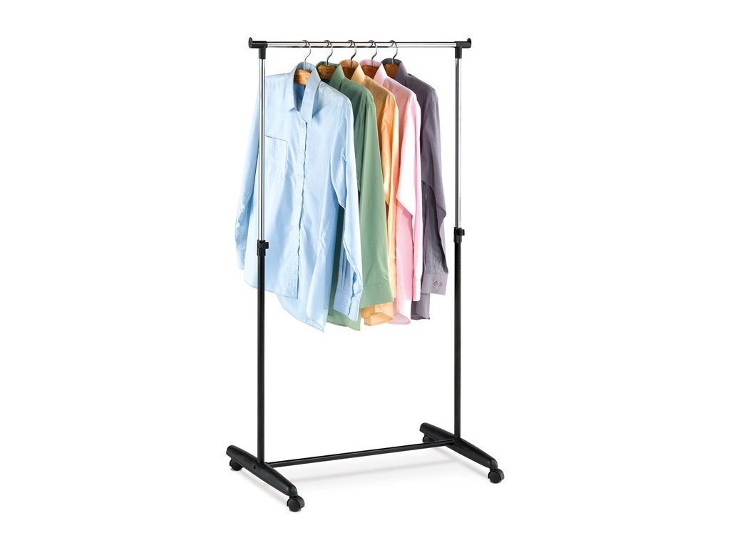 Jednoramenný stojan na šaty v čiernom prevedení kombinuje pevný kovový rám s plastovými prvkami pre jednoduchú manipuláciu a stabilitu. Výškovo nastaviteľná tyč umožňuje prispôsobenie podľa potreby, zatiaľ čo chrómovaná tyč na zavesenie odevov zabezpečuje hladký povrch, ktorý nepoškodzuje látku. Podstavec je vybavený kolieskami pre ľahký presun v interiéri, čo uľahčuje organizáciu priestoru. Stojan je vhodný pre domáce aj komerčné použitie vďaka svojej robustnosti a jednoduchému dizajnu, ktorý sa hodí do rôznych štýlov interiérov.