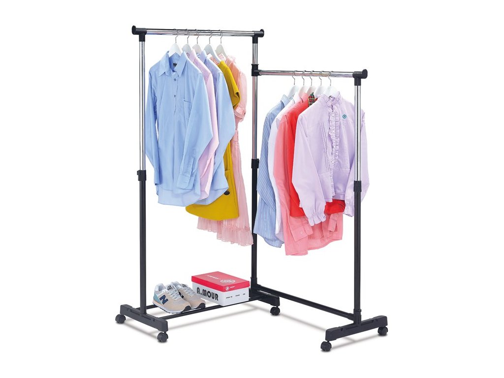 Stojan na šaty s odkladacím priestorom v čiernom prevedení kombinuje pevnú kovovú konštrukciu s chrómovanými prvkami a plastovými doplnkami pre jednoduchú manipuláciu. Výšku je možné nastaviť podľa potreby, čo umožňuje flexibilné usporiadanie odevov rôznych dĺžok. Otočný mechanizmus 360° zabezpečuje pohodlný prístup ku všetkým zaveseným kúskom, zatiaľ čo spodný odkladací priestor ponúka miesto na uloženie topánok alebo krabíc. Stabilná podstava na kolieskach umožňuje jednoduché presunutie stojana bez námahy. Vďaka kombinácii materiálov je stojan navrhnutý pre dlhú životnosť a jednoduchú údržbu.