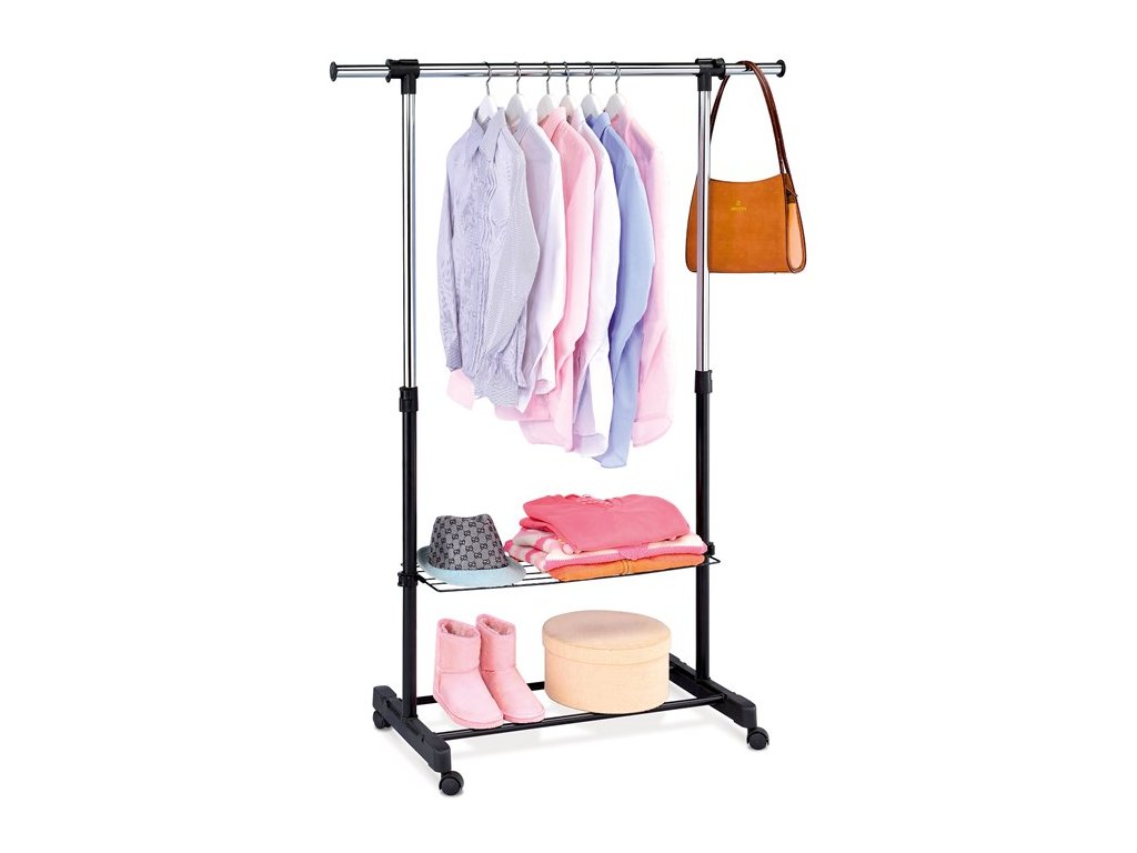 Stojan na šaty s odkladacím priestorom a poličkou v čiernom prevedení kombinuje pevný kovový rám s chrómovanými prvkami pre moderný vzhľad a dlhú životnosť. Výškovo nastaviteľná tyč umožňuje zavesenie oblečenia rôznych dĺžok, zatiaľ čo spodná drôtená polička ponúka priestor na uskladnenie topánok alebo ďalších doplnkov. Praktický odkladací priestor na boku je vhodný na zavesenie tašiek či šál. Stojan je vybavený štyrmi kolieskami pre jednoduchú manipuláciu a stabilnou základňou, ktorá zabezpečuje bezpečné postavenie aj pri plnom zaťažení. Vďaka kombinácii kovu a plastu je ľahko udržiavateľný a vhodný do domácností aj komerčných priestorov.